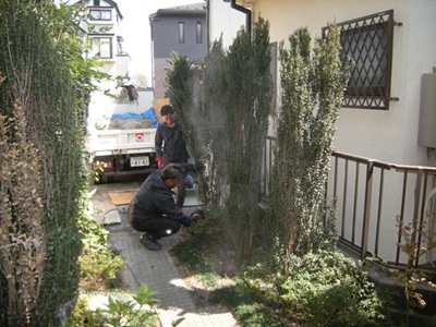 すべてを地面の高さでカットということではなかったので、植木職人も含めて作業いたしました。